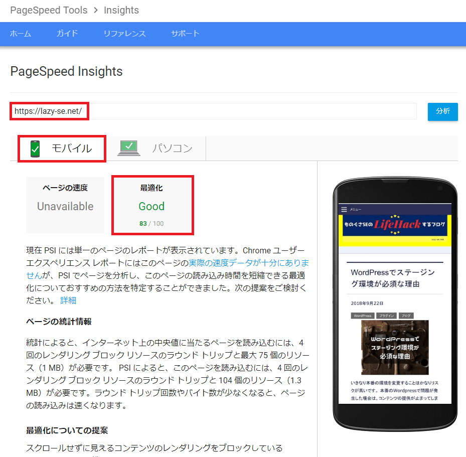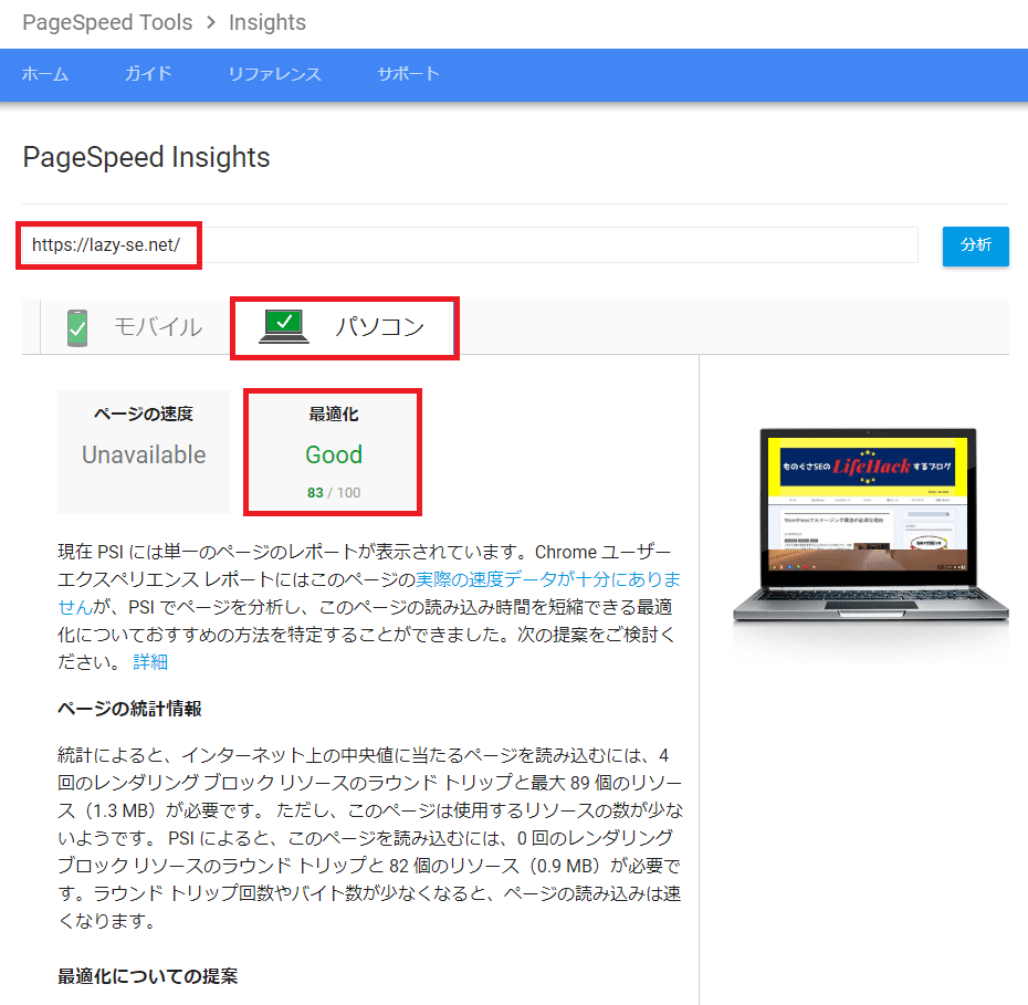 最適化の結果が緑色で「Good」となっていれば問題ありません。