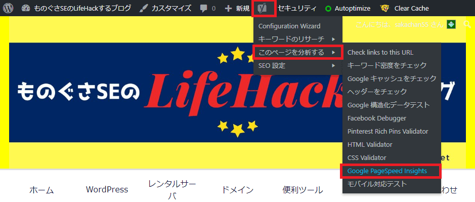 なお、「Yoast SEO」プラグインを導入すると、管理者ユーザーでログインした状態で、WEBページを表示した際に、上部アイコンから簡単にスピードテストすることが可能となります。