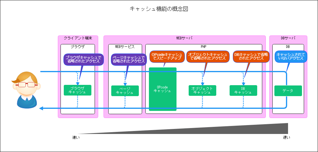 簡単に言うと、WEBページの毎回同じデータを読み込む必要がある部分を、キャッシュと呼ばれる一時的な保存領域に格納しておいて、読み込み要求が来たら高速で読み込むことで表示スピードを改善する機能となります。